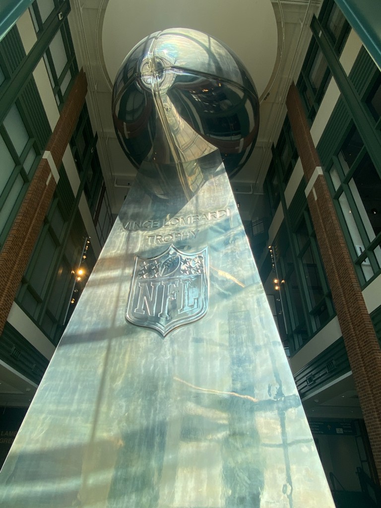 After his premature death from cancer in 1970, the NFL Super Bowl trophy was named in his honor. There’s a larger than life replica inside the stadium, greeting fans a they make their way into the atrium.
